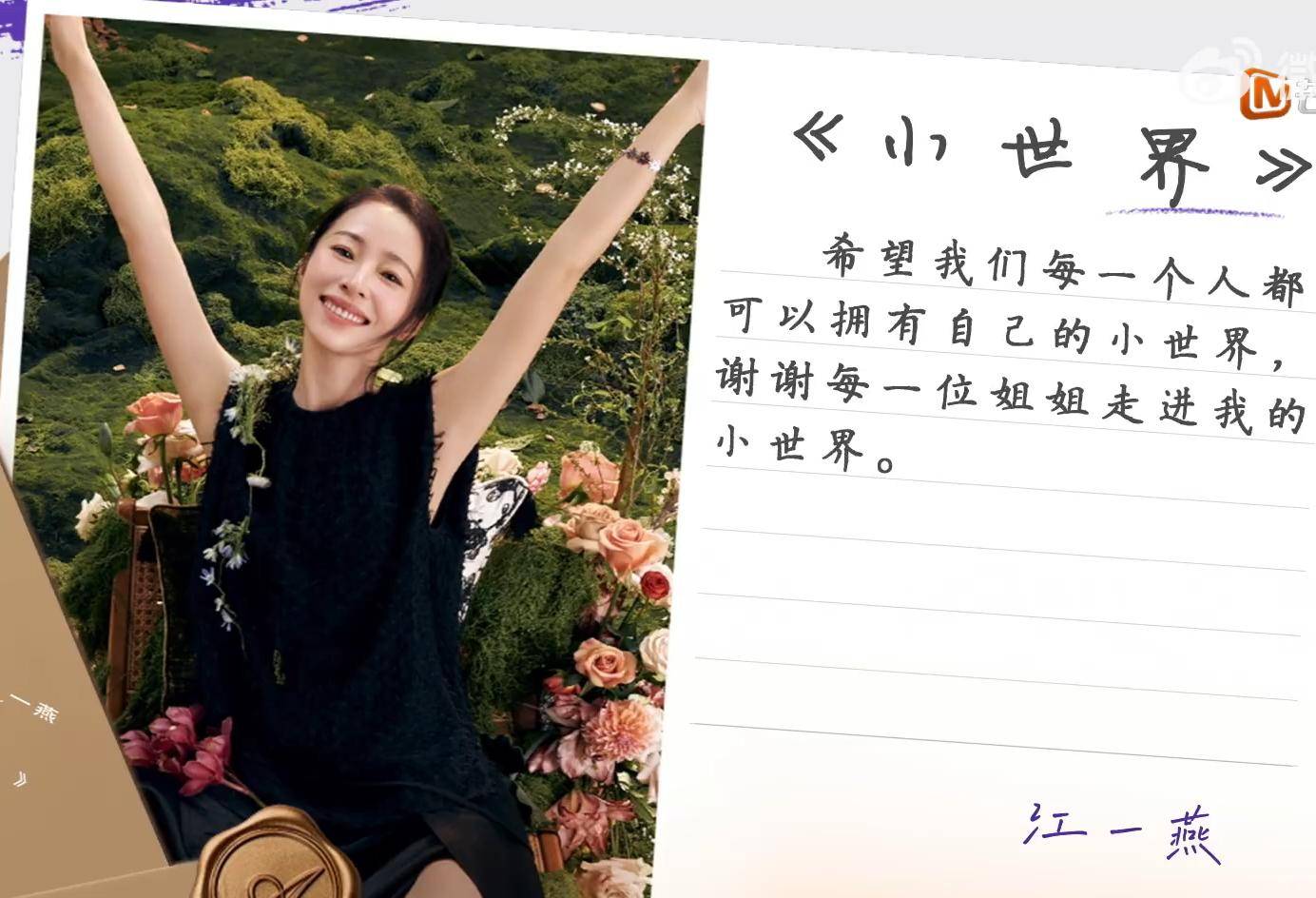 官宣离婚后,江一燕说:“我有一个小世界,闪耀且自洽,希望你们也在自己的小世界里熠熠星辉。”她的信标题就叫《小世界》,感谢姐妹们走进自己的生活。